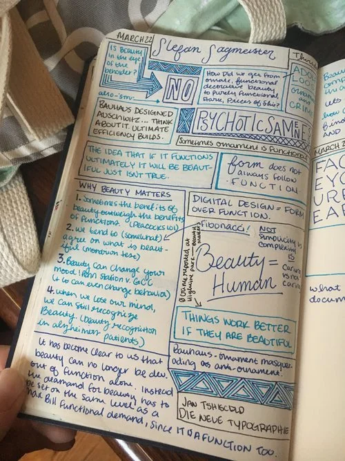 All this to be said, Sagmeister taught a lot on several other aspects of beauty (including how the Bauhaus movement affected things...) and if you can sift through any of my notes from the evening I will leave them here. This was a great, thought-provoking talk, so if you're ever in the position to go see Stefan Sagmeister speak I would definitely suggest it. Let this be a good reminder of the importance of beauty in design, and thanks so much for reading my thoughts on it!